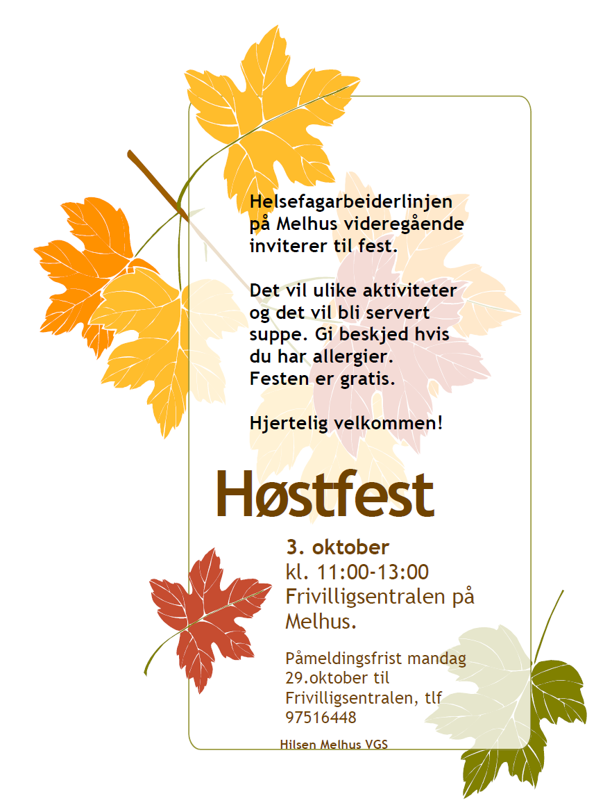 Fredag 3.oktober inviterer elevene ved helsefagarbeiderlinjen til Høstfest på Frivilligsentralen.